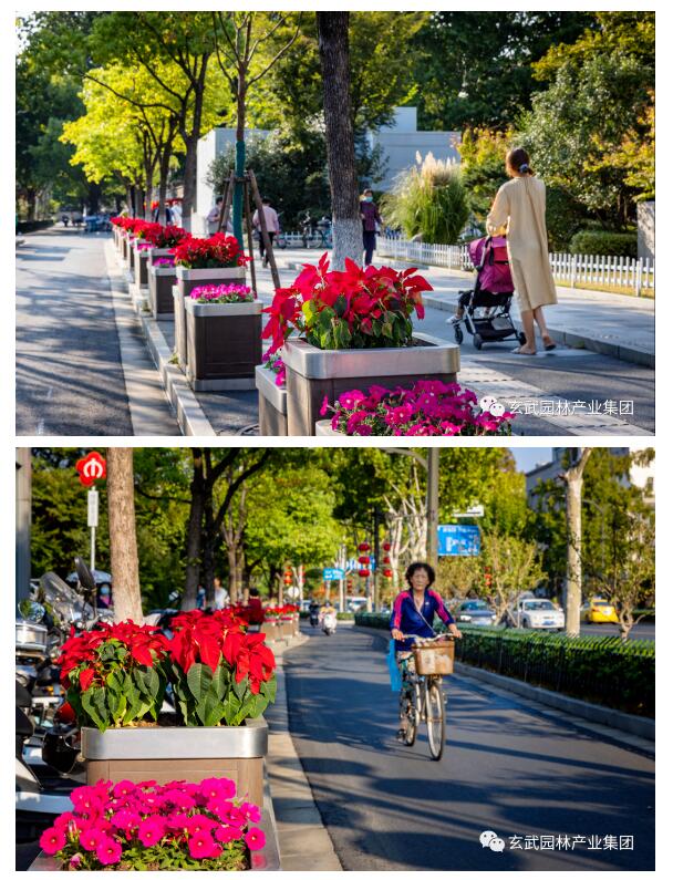對北京東路、珠江路、市府門前路、太平北路、玄武大道、龍蟠路等綠島及島頭花境選用一品紅、萬壽菊、三角梅、洋鳳仙、麗格海棠、矮牽牛、歐月、藍雪花、超級海棠、翠蘆莉、一串紅、孔雀草、石竹等靚麗多彩、品相精致的花卉進行布置,城市街景處處繁花似錦、百花齊放,營造栩栩如生、欣欣向榮的景觀效果。