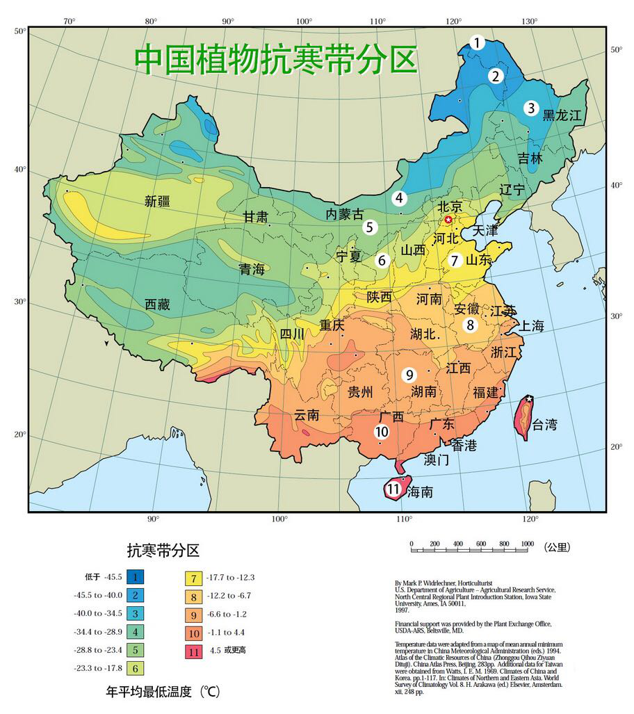 原品種作為雞爪槭的變種,可適應(yīng)最低-20℃的低溫,種植范圍廣,北至京津冀,南至湖北、四川、貴州等地(如圖7區(qū)﹣9區(qū))。其冬季雖然落葉,但枝條亦能呈現(xiàn)紅色,所以,金禧非常適合在黃河以北,例如說北京,作為城市色塊產(chǎn)品的補(bǔ)充,為北方單調(diào)的色塊增彩添色。